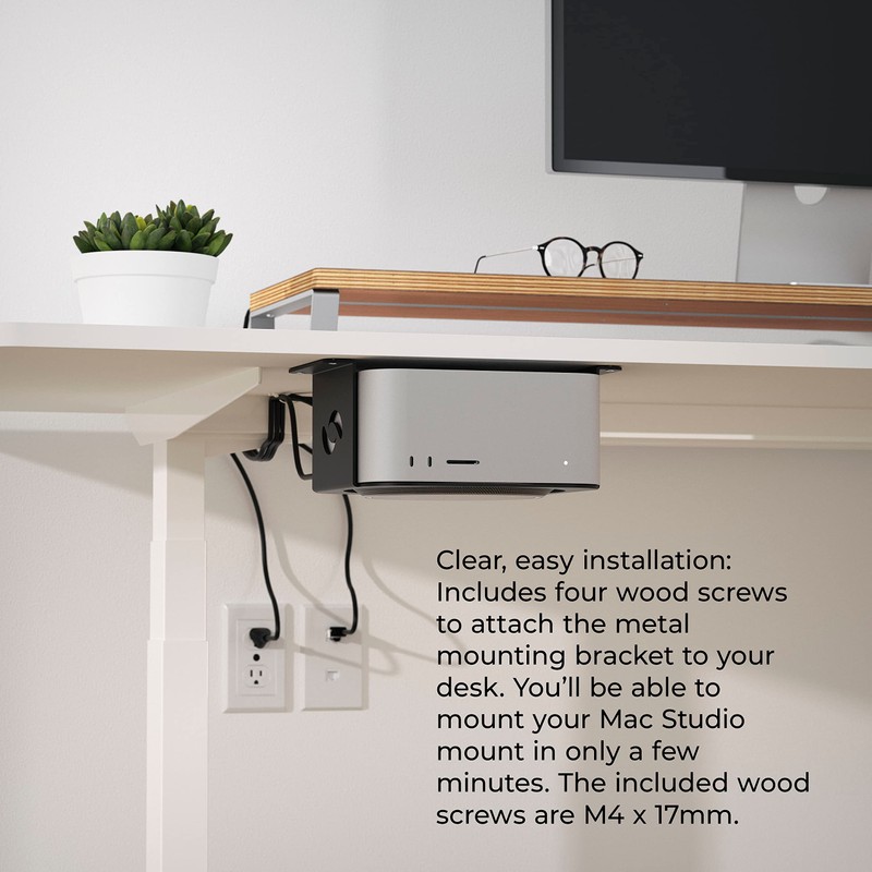 - Clear, easy installation: Includes four wood screws to attach the metal mounting bracket to your desk. You’ll be able to complete your Mac Studio mount in only a few minutes. Compatible with both Mac Studio M1 Max and Mac Studio M1 Ultra.