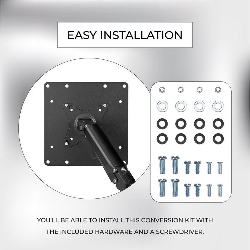 HARDWARE INCLUDED: This VESA conversion kit comes with adapter plate screws, nuts, M6 screws, M8 screws, washers, and plastic spacers