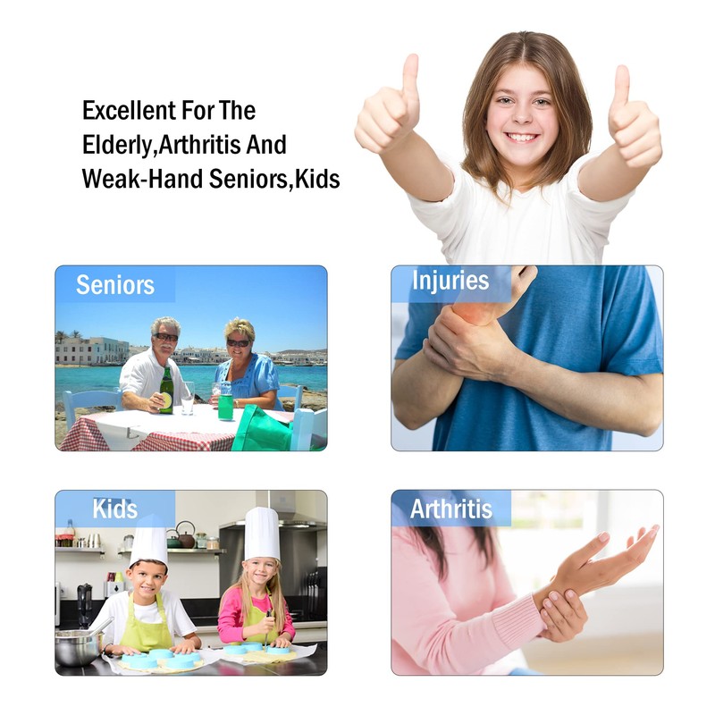 - Specially designed for weak hands - Its difficult for seniors and arthritis, rheumatoid sufferers, limited hand strength mobility or hand injuries sufferers to complete everyday tasks, especially while cooking. The HUMANFUN set will give your hands the power to open any jar, can or bottle. practical, convenient, save your time and strength, and putting NO extra stress on your fragile hand joint and ligaments!
