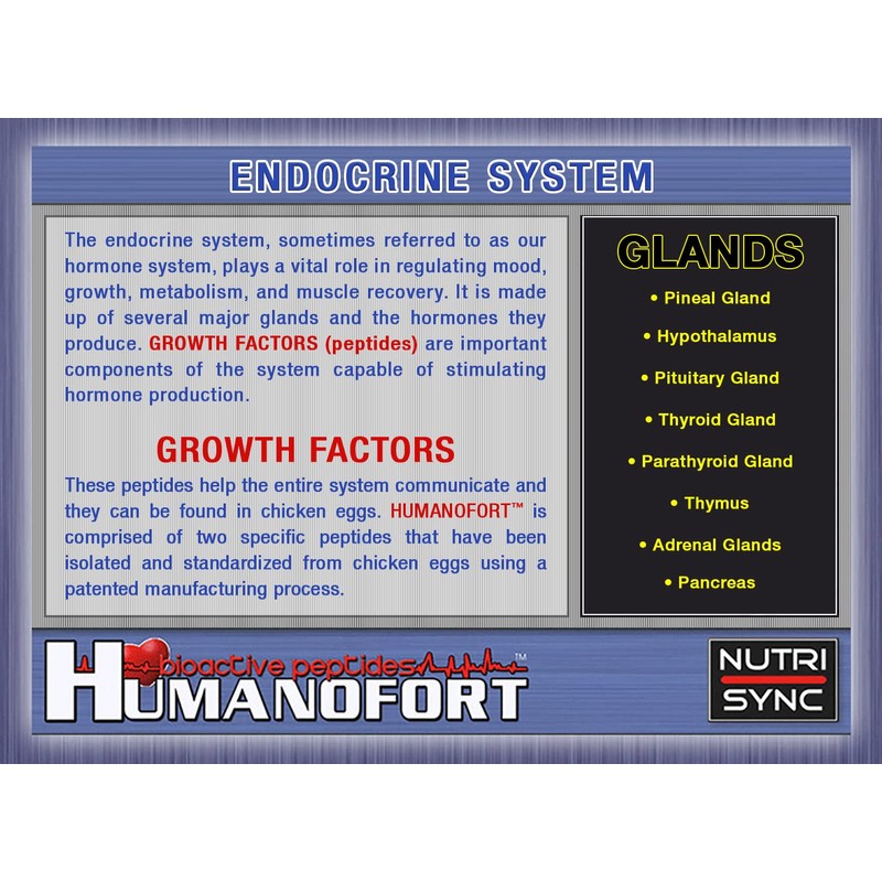 The endocrine system, sometimes referred to as our hormone system, plays a vital role in regulating mood, growth, metabolism, and muscle recovery. It is made up of several major glands and the hormones they produce. GROWTH FACTORS (peptides) are important components of the system capable of stimulating hormone production. These peptides help the entire system communicate and they can be found in chicken eggs. HUMANOFORT™ is comprised of two specific peptides that have been isolated and standardized from chicken eggs using a patented manufacturing process.