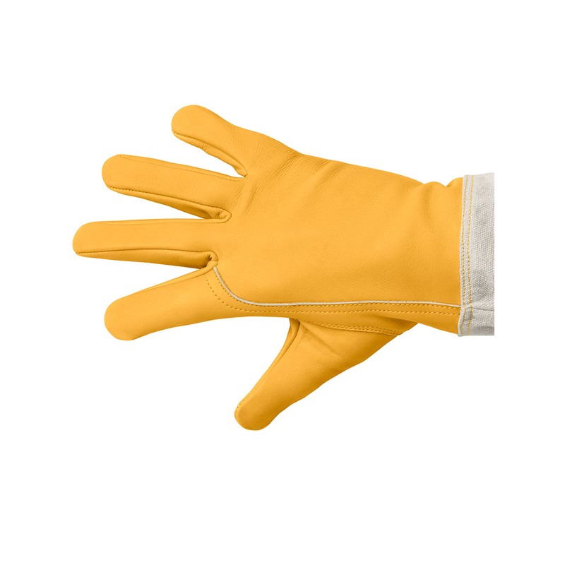 - Professional beekeeper gloves with durable cowhide hands, heavy duty canvas sleeves, and elastic cuffs