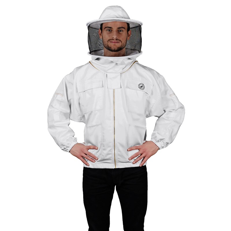 - Polycotton beekeeper jacket with self-standing round veil, heavy duty brass zippers, durable double stitched pockets and a luxurious canvas carry bag