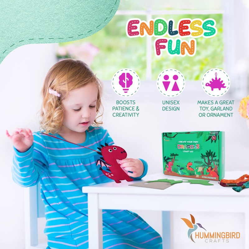 - 🐲 SCREEN-FREE ENTERTAINMENT: Tired of your little kid sitting in front of a screen like a zombie!?! These dragon pattern sewing kits for children will have your child engaged and active in a constructive, cool activity. It's loads of fun, and safer than a sewing machine. Get their hands on some fabric, and this crafting kit will offer hours of enjoyment!