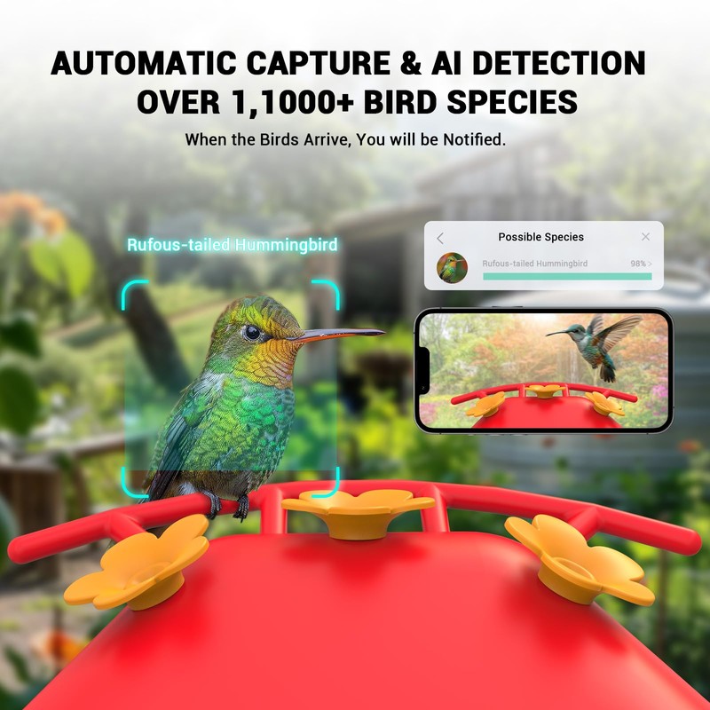 - 【Accurate AI Identification 】Hummingbird Feeder With Camera Using an Advanced AI Algorithm, the Camera Automatically Captures and Records Beautiful Moments When Hummingbirds Fly By, Sending Real-Time Notifications to Your Phone. Plus, All New Users Can Enjoy a One-Month Free Trial of the AI Identification Service.