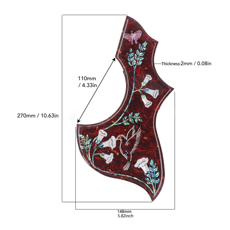 1、RELIABLE MATERIAL: Hummingbird pickguard is made of celluloid and excellent crystal epoxy resin material for a long service life and impact resistance 2、SELF ADHESIVE: Hummingbird pickguard come with self adhesive adhesive that adhere to guitars when removed, making it ideal for replacing damaged guitars 3、DECORATIVE AND PROTECTIVE: The scratch proof plate can not only play a good protective role, but also has a good decorative effect, practical and beautiful 4、EASY TO USE: Hummingbird acoustic pickguard is easy to install and will not damage the guitar or affect the sound quality, giving you the most original experience 5、PERFECT REPLACEMENT: This guitar pickguard with hummingbird style pattern, easy to peel and stick, great for upgrade or replacement part, fit standard size acoustic guitars