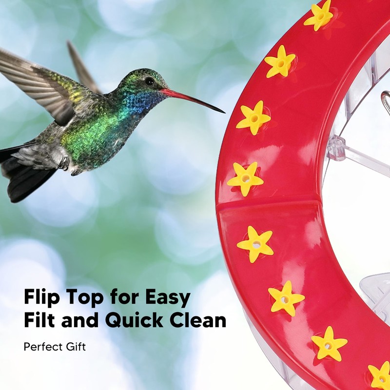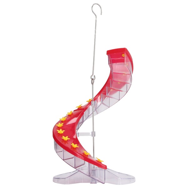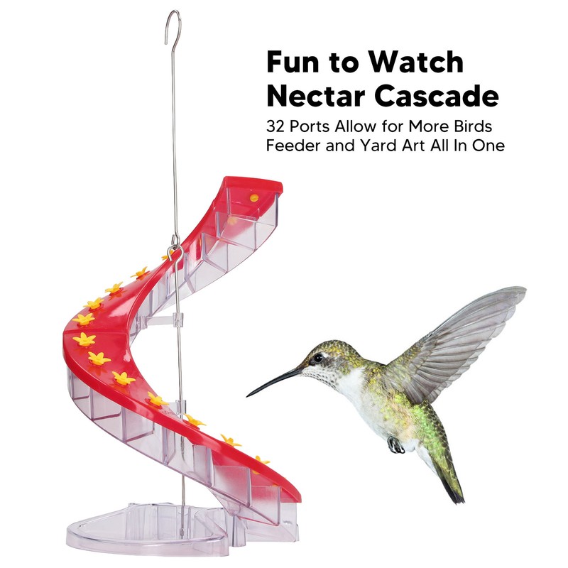 1、EASY TO FILL: Versatile flip top. The flip top makes it easy to clean quickly and fill from the top. No more upside down padding. There is no more confusion. 2、HELICAL: The 32 ports are arranged in a heilcal design. The contorted shape mimics flower clusters found in nature, and thus more closely resembles instinctive feeding patterns. 3、ATTRACTIVE: The red cover and yellow ports are especially attractive to hummingbirds. Many ports are provided in a compact size, attracts more birds. 4、FUN: It was fun to watch seeds and nectar fall in layers through our spiral feeders. Allow more birds to be fed at the same time, give you more detail observation. 5、32 PORTS: The birds will spend more time up and down the helical bird feeder, accessing many ports. There are 32 ports for birds to be fed, make them stay longer.