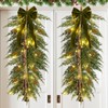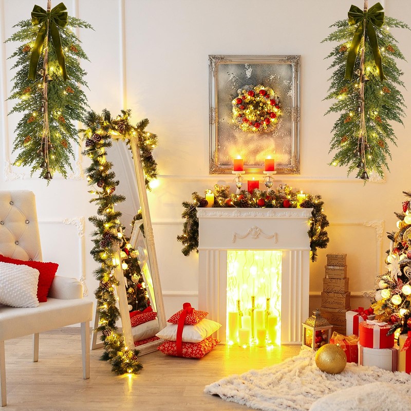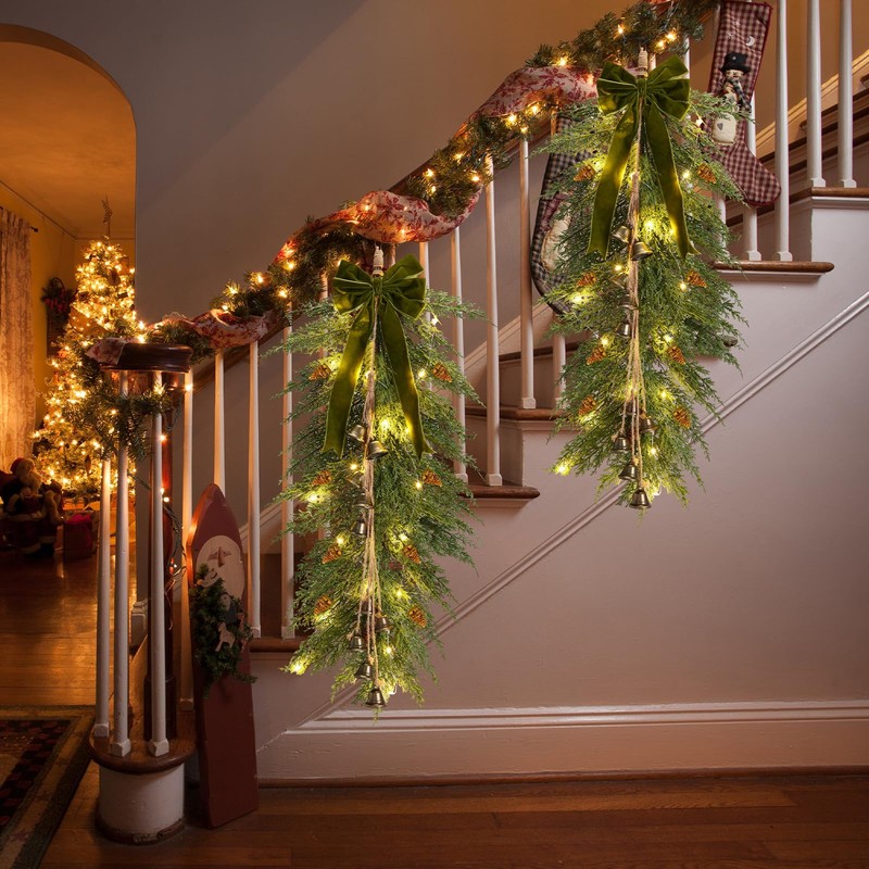 Hungdao 2 Pack 36" Large Christmas Pine Teardrop Cedar Swag with Lights Velvet Bells Bow and Faux Pine Cones Rustic Christmas Artificial Greenery Swag Wreath for Xmas Farmhouse Home Wall Decor(Green)
