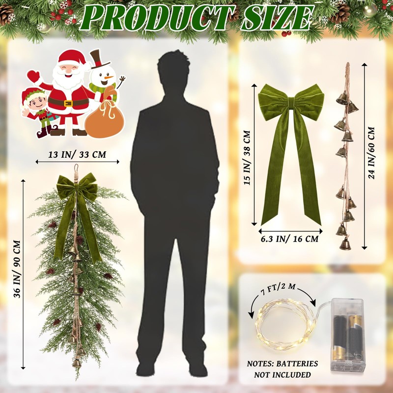 - Gorgeous Christmas Swags: you will get 2 Christmas swags made of cedar pine, each one comes with pine cones, 10 metal bells, a green velvet bow and 20 LED light string (batteries not Included), rustic style for your festival Christmas decor