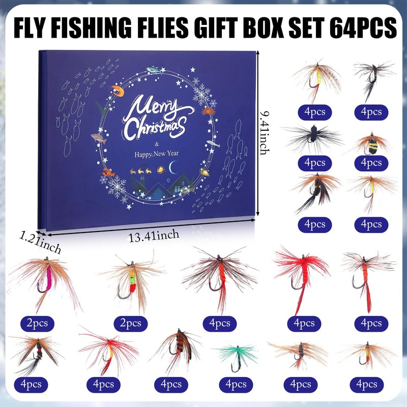 - Abundance and Diversity of Lures: this fishing advent calendar delivers a generous collection of 64 flies kit includes Mayfly dries, Streamers, Leeches, Wet Flies, Terrestrials, Miscellaneous dries, and Caddisfly dries in assorted sizes and colors, and Caddisfly dries in various sizes and colors