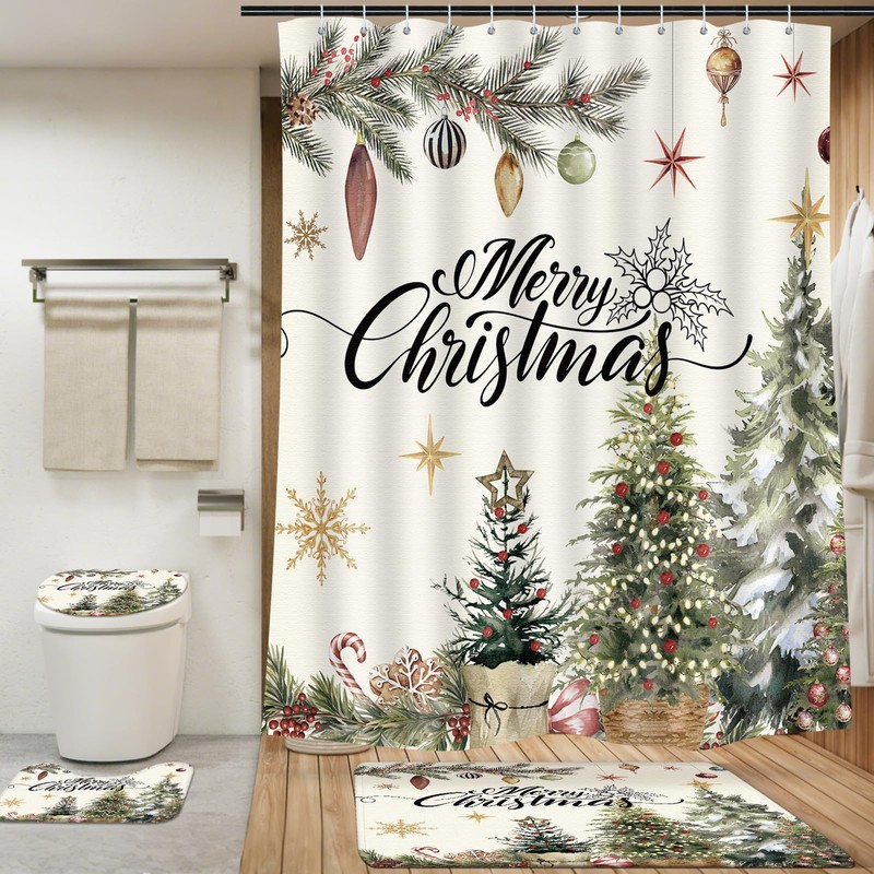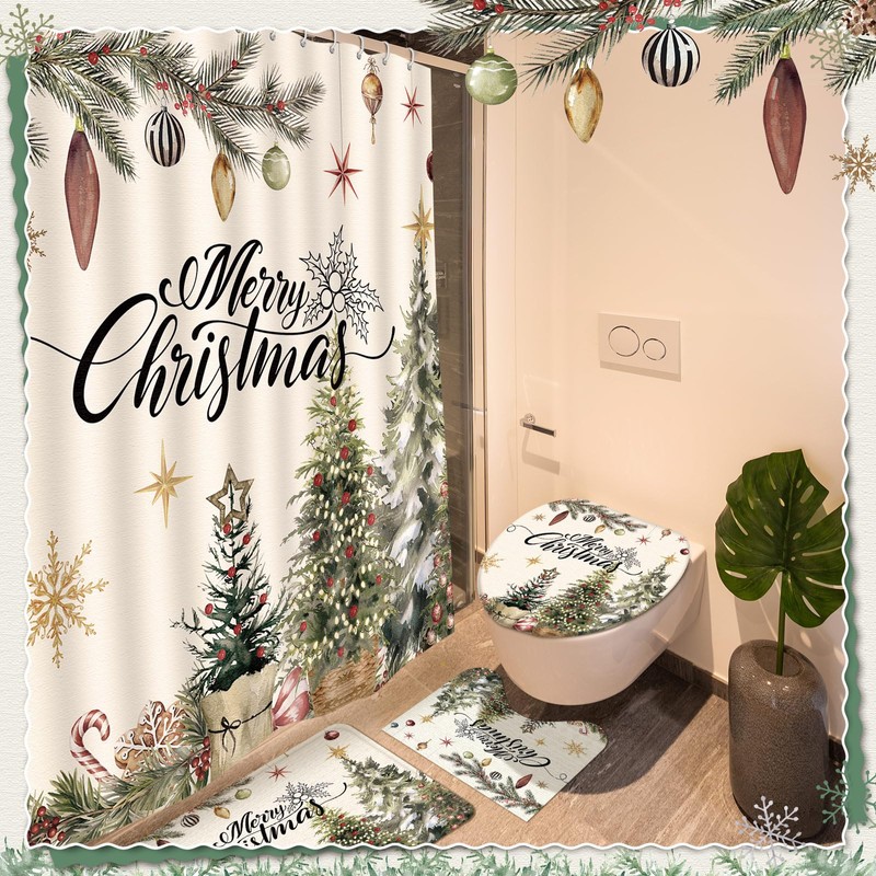 - Inclusive Set: enjoy 4 pcs in one Christmas bathroom set; This pack provides a shower curtain, a U shaped bath mat, a nonslip rug, and a toilet lid cover, all complete with 12 shower curtain hooks; It is the ideal set to meet all your basic bathroom need