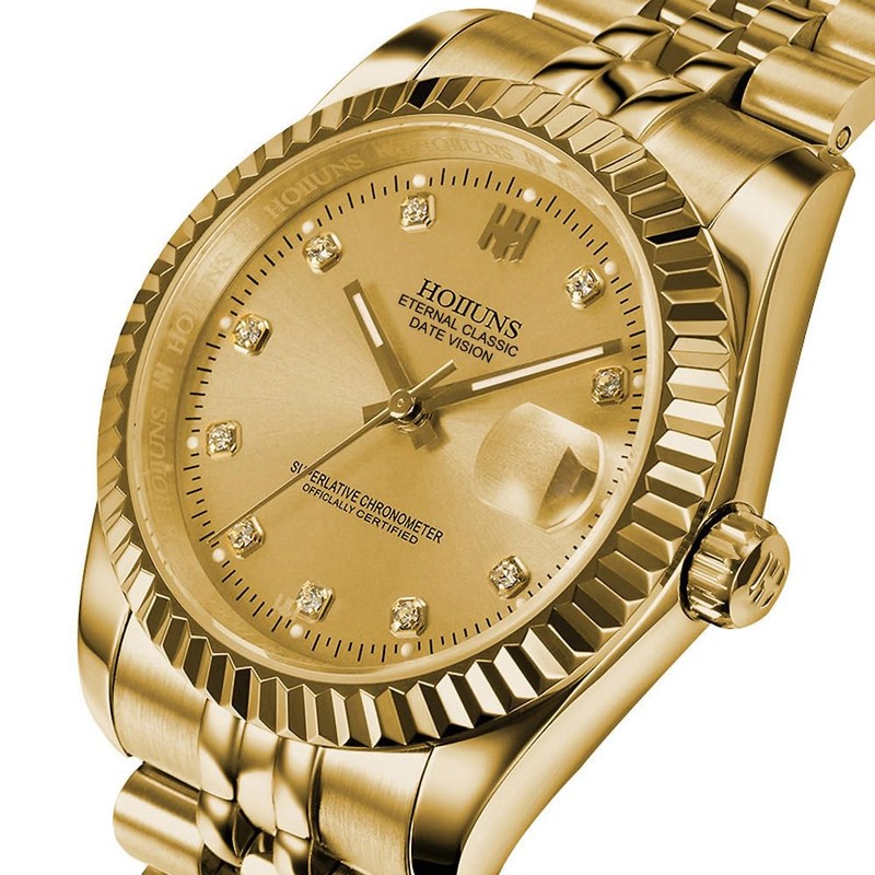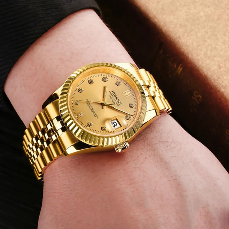 HUNRUY 41MM Mens Gold Plated Automatic Watches with Day and Date, Gold with Date, Luxury