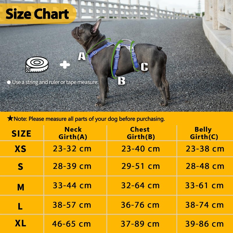 - The X-large escape proof harness(Neck Girth:18"-25.5" 46cm-65cm, Chest Girth:14.5"-35" 37cm-89cm, Belly Girth:15.5"-34" 39cm-86cm, Back Length:11" 28cm. Ideal for Rottie,Golden Retriever, German Shepherd, Bullmastiff, Saint Bernard, Husky, etc) has the strap on the belly that can hold your dog in place and prevent him/her from escaping.The full-body reflective design ensures a safer walk day and night.You will never be worried about your dog not being seen by cars when walking your dog at night.