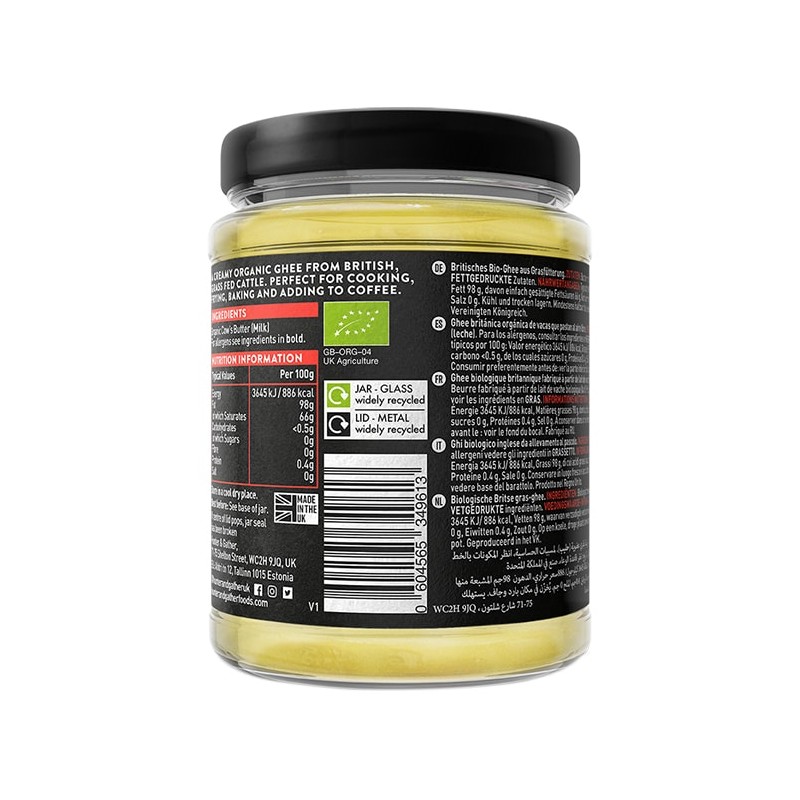 Sunshine in a jar. A creamy organic ghee from british, grass fed cattle. Perfect for cooking, frying, baking and adding to coffee.
