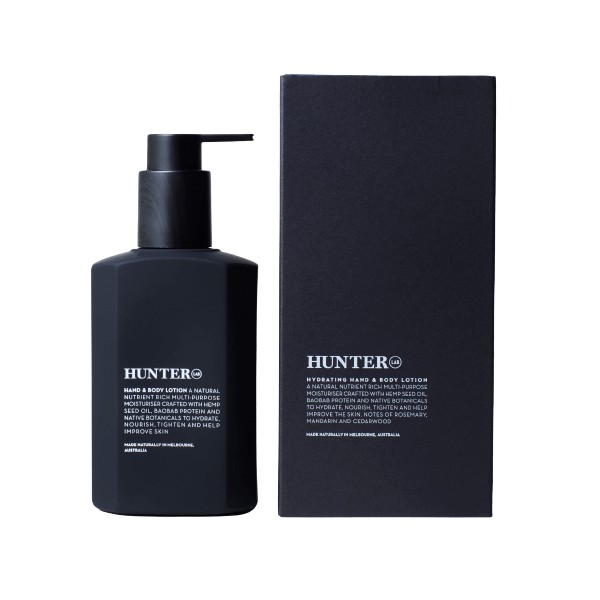 Hunter Lab Hydrating Hand & Body Lotion 250ml is a natural nutrient-rich multi-purpose moisturizer crafted with hard-working Hemp Oil and Baobab Protein, and native Aniseed Myrtle, Mountain Pepper, and Wild Rosella Flower extracts to intensely hydrate and nourish the skin.