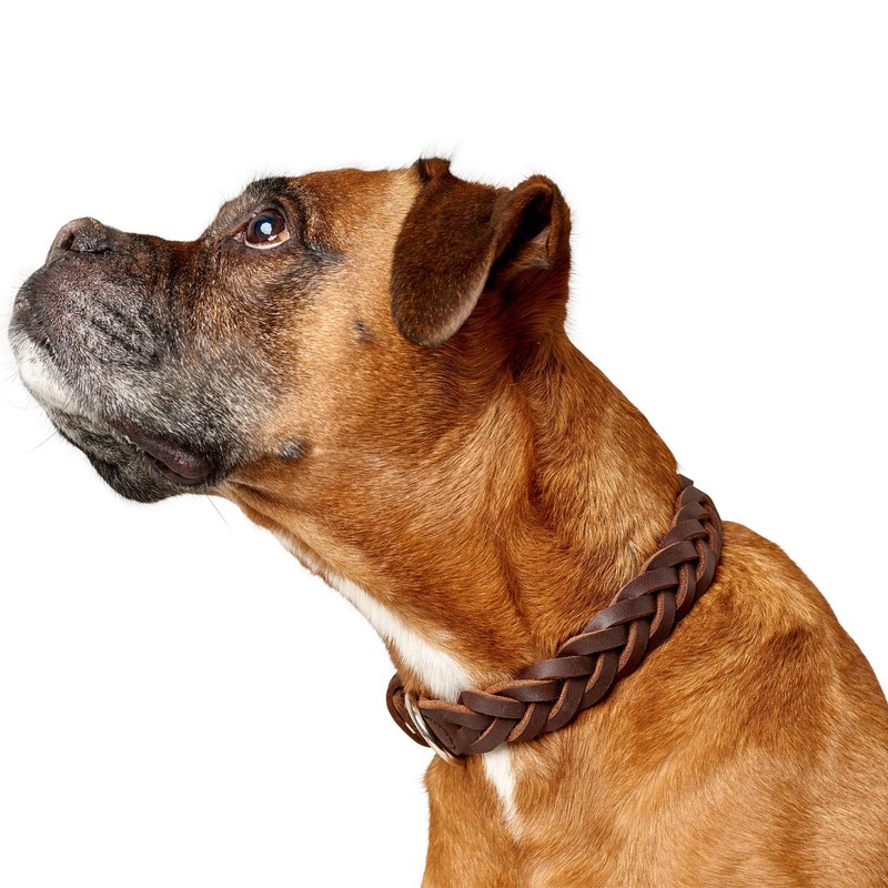 - Artfully hand-braided dog collar made from a continuous piece of leather