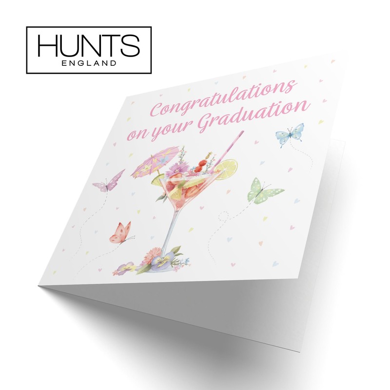 Hunts England - Pink Cocktail And Butterflies Elegant Graduation Card For Her - Milo's Gallery - Female Congratulations Card - Well Done Card For Graduating