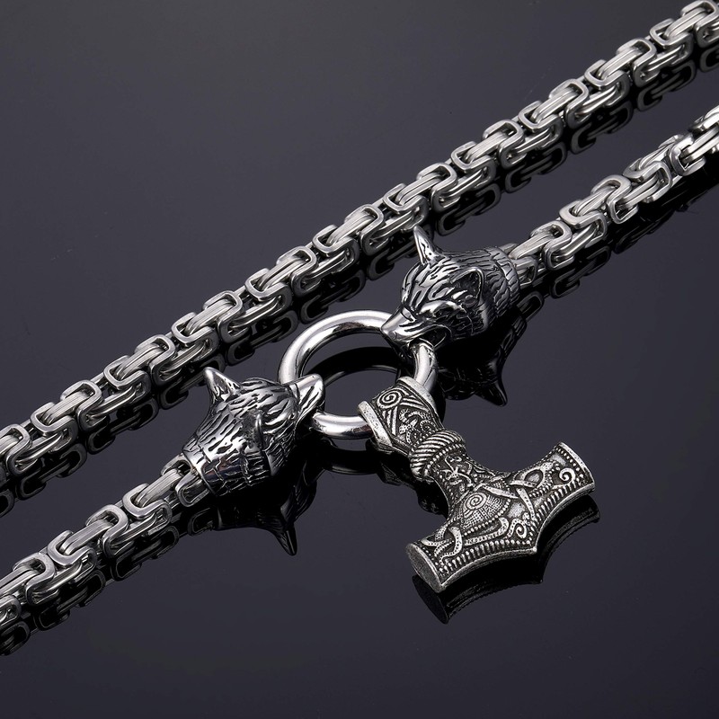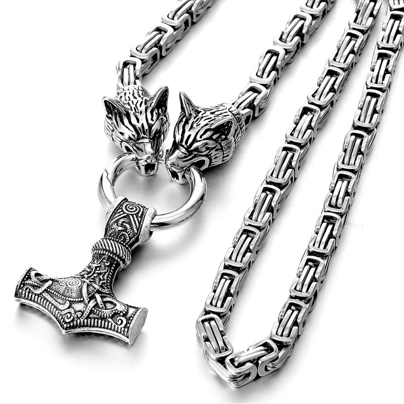 HUO HUA Mjolnir Collar Colgante Con Cabeza de Lobo Vikingo de Acero Inoxidable Cadenas Rockeras Para Hombre (Thor Mjolnir)