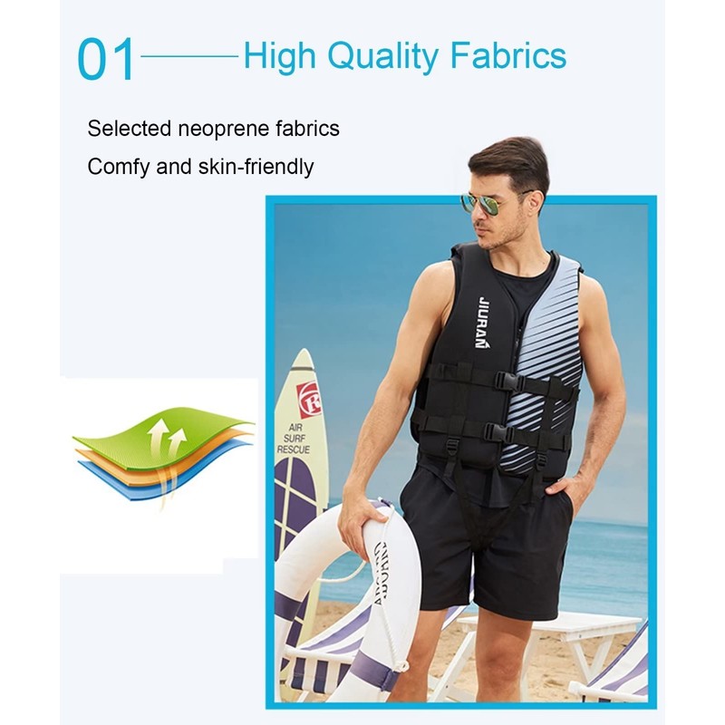 - Double Webbing Straps: Two durable webbing straps are used on the back, which can be adjusted, making it tighter to wear and safer to use, the smooth edging strips around the life jacket make the overall look simple and fashionable
