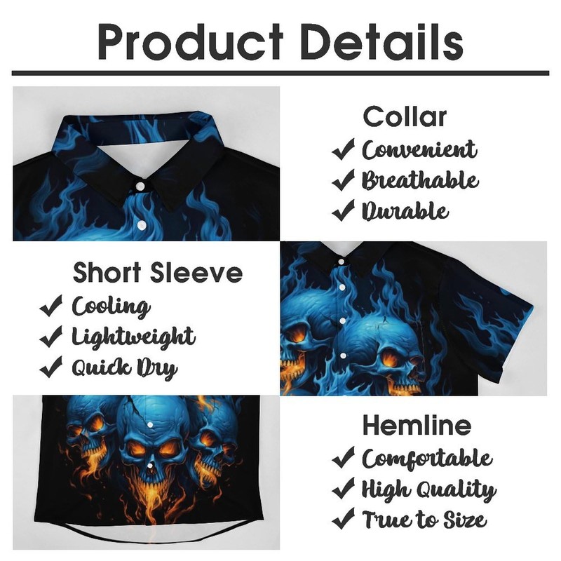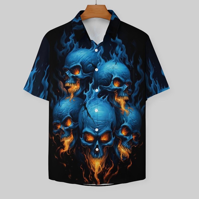 - Printing: The creative design of skull cool graphic adds vitality and fashion to this Hawaiian button up shirt. Short Sleeve Design: Keep cool in the summer heat with our short sleeve shirts. Button Down Closure: The classic button down design allows you to easily adjust the shirt to your desired fit.regular fit men shirts, which looks very handsome and casual, out-of-office style, daily wear.