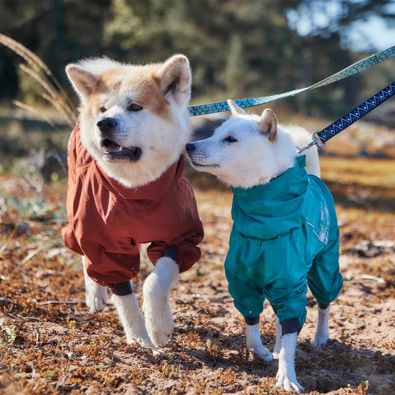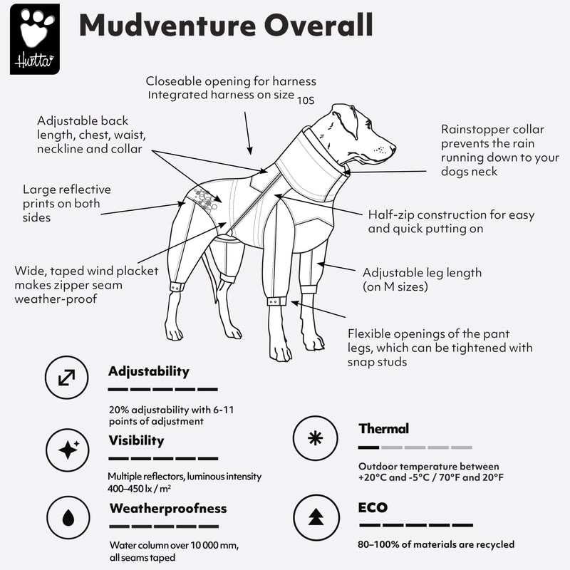 The Mudventure Overall ECO not only says you can, its lightweight-yet-durable, weatherproof fabric and fully taped seams prove it. Fluffy little friends love to wear it as a standalone piece, but for everyone else it’s designed also for layering atop the soft and toasty Midlayer Overall for added warmth. Your dog will find just the right level of warmth and comfort whether it’s a milder midseason day or a cold and rainy winter day. Your dog will also show the strongest surf who’s the boss. Plus you can feel good about your purchase because the Mudventure Overall ECO is made from earth-friendly 100% recycled fabric. The overall’s clever half-zip construction makes dressing and removal quick and easy, something you and your dog will both appreciate. The Mudventure Overall ECO also features incredible adjustability. Handy elastic cords let you fine tune the back length, leg length, waist, chest and neck to find your dog’s perfect fit. The pant legs even have sturdy snap studs for dogs that want a more tapered leg fit. Another highlight is the overall’s Rainstopper collar that keeps wetness out and off of your dog’s neck. Put it all together and that’s how you stay dry and comfortable longer in any weather. For even more wet-weather protection, the Mudventure Overall ECO features a wide, taped wind placket that makes the zipper and seam weatherproof. There’s even a closeable opening on top to connect a leash to a harness and keep rain out. The overall also helps keep mud and sand out of your dog’s coat, which means less mud and sand in your living room rug. After that, you’re ready to hit the trail or coast or even monsoon season if you’re up for it. Oh, and don’t forget the large, luminous reflective designer prints on both sides which provide added safety during those early morning and late evening walks in busy urban areas. We’re all for rainy-day fun at Hurtta and the Mudventure Overall ECO is a sure way to make the most of every one.