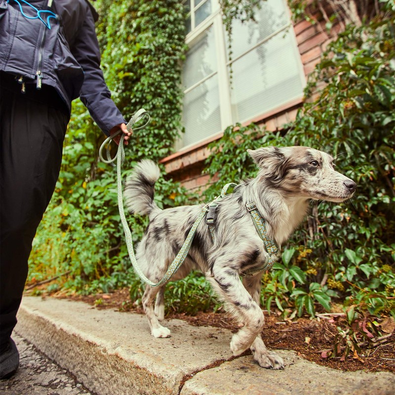 - The strap is quick and easy to put on and the soft padding and straps made from 100% recycled materials ensure comfort on any trip. There is also a built-in handle on the back of the harness for better control of your dog in difficult terrain or other difficult situations.