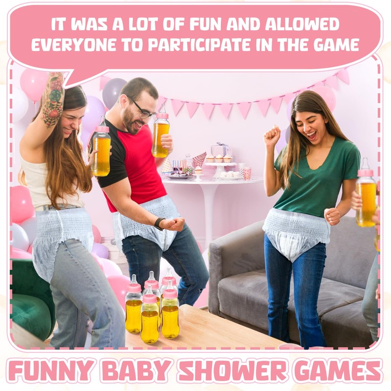 - Complete Baby Shower Game Supplies: this bottle chug baby shower games package includes 12 pcs baby bottles for baby shower games and 12 adult size diapers, which are large enough for adults without worrying about getting stuck and affecting the game experience; This complete baby shower play set brings the joy and excitement of a baby shower to life, giving everyone the opportunity to participate and enjoy