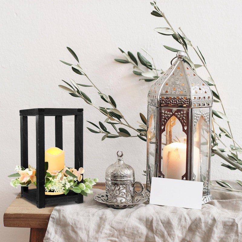 Hushee 60 Pcs Wooden Wedding Lantern Centerpiece Integrated Candle Holders with Candles and Candle Wreaths Rustic Wooden Candle Lantern Decor for Wedding Party Table Valentine Decor (Black)