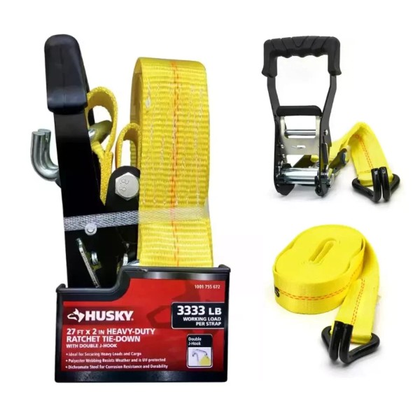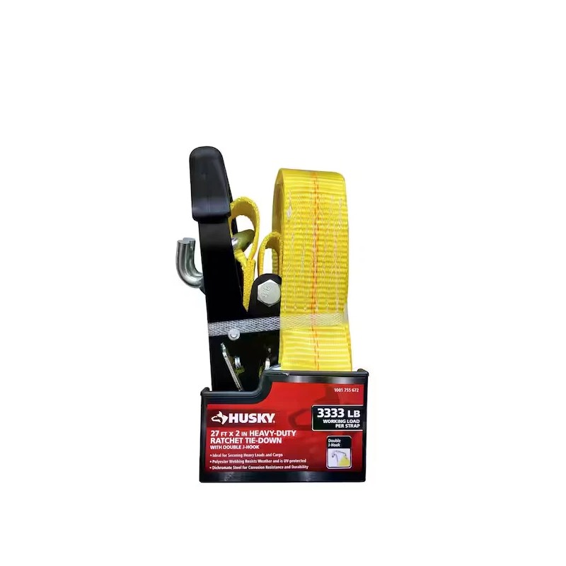 Husky 27 ft Heavy-Duty Ratchet Tie-Down Strap with J Hook, 2 in. Webbing, 3333 lb Load