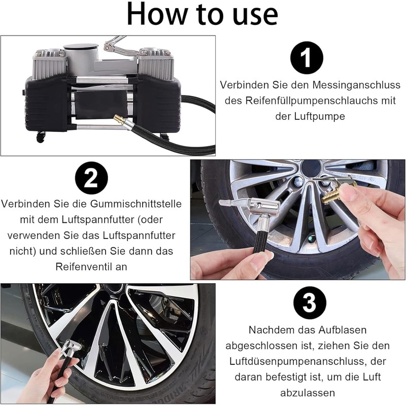 - 【Einfach zu Installieren】Schrauben Sie ein Ende des tire kompressor schlauch an den Schlauch des Inflators und das andere Ende an das Luftfutter des Reifenventils, starten Sie dann den Inflator, nachdem das Aufpumpen abgeschlossen ist, müssen Sie die Luft ablassen, ziehen Sie einfach die Luftdüse am Pumpenanschluss fest.