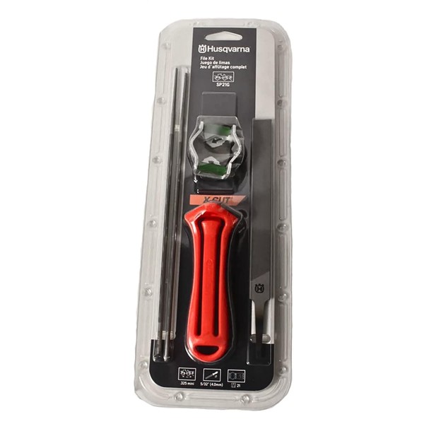 - Husqvarna Chainsaw Sharpening Kit: Includes one (1) file handle, one (1) combination file guide (featuring a 2-in-1 roller file guide and depth gauge), two (2) round files and one (1) flat file chainsaw sharpening tool