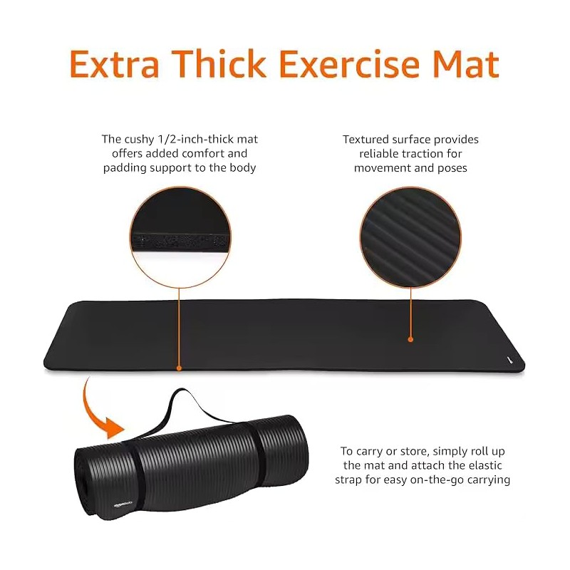 Hussain LLC Yoga Mat, 1/2 Inch Thick NBR Foam, Non-Slip Exercise Mat with Carrying Strap