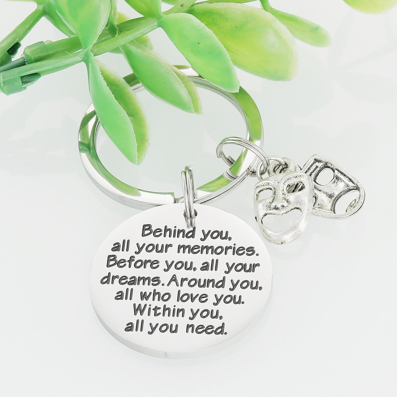 - 🎭🎭Theater Themed Gifts Comedy Tragedy Broadway Musical Theatre Keyring💗💗-----Engraved with sentence “Behind you, all memories. Before you, all your dream. Around you, all who love you.Within you, all you need.” Use this Drama Keychain to express your encouragement and support to the Drama Student or the Actor and Actress in drama.