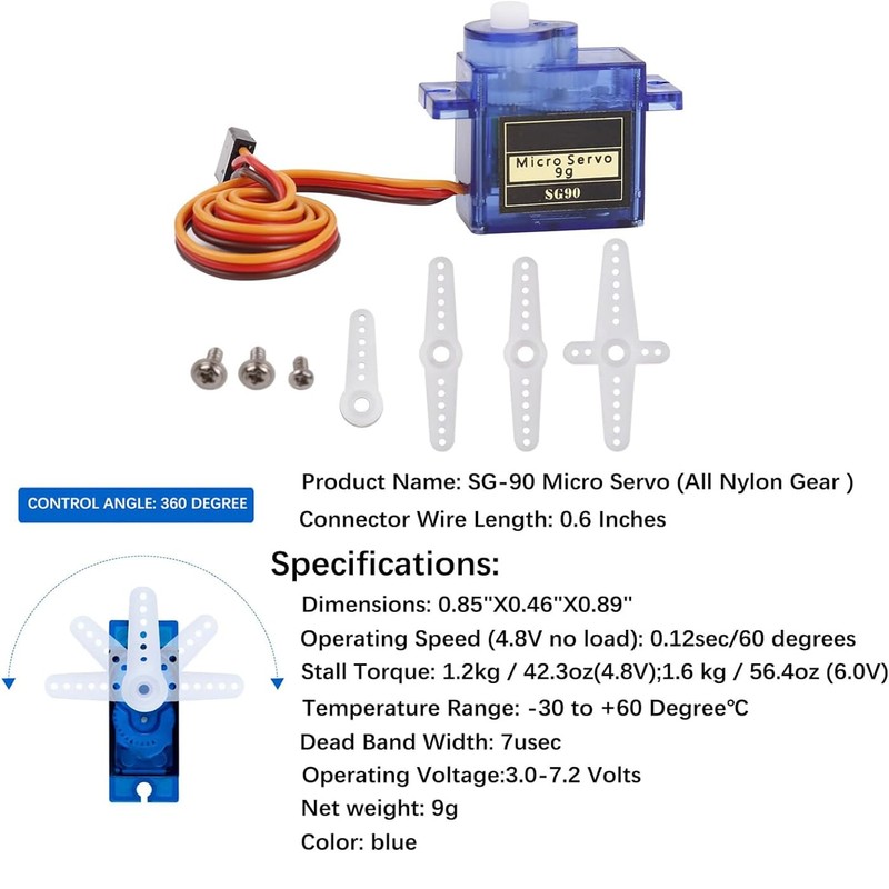 - SG90 9G micro servo motor for remote control helicopters, micro robot, robot arm and boats.