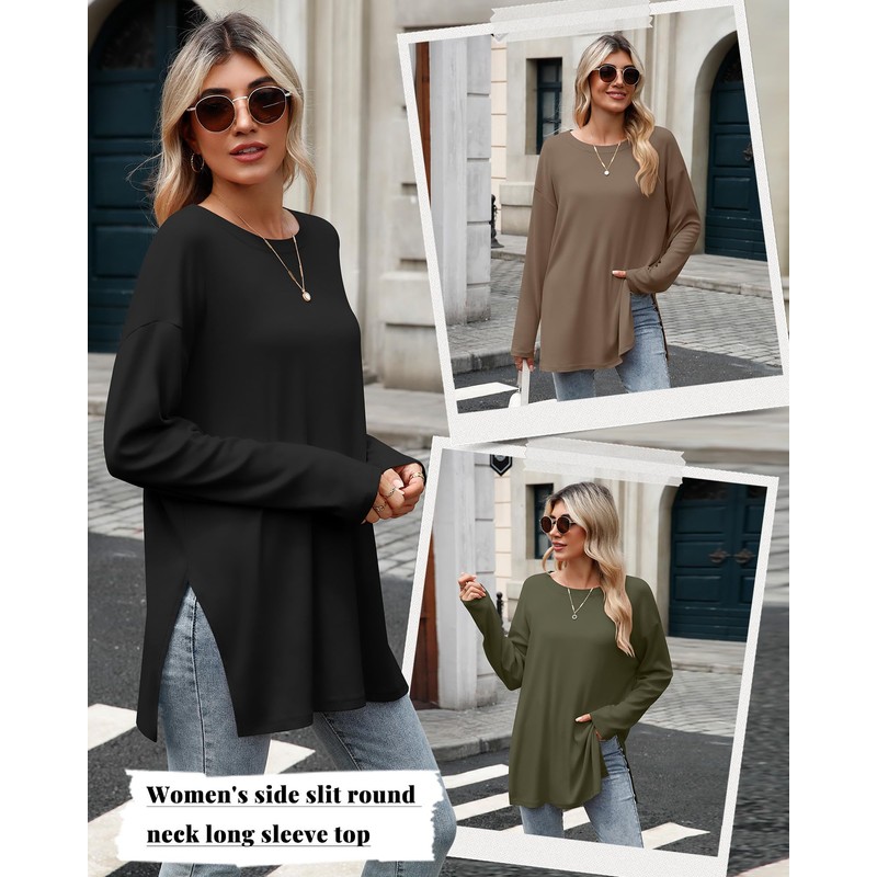 Huukeay 3 Pack Oversized Long Sleeve Shirts for Women Cotton Workout Side Split Gym Crewneck Tops Loose Basic Tee Fall(Black, Army Green, Coffee,Large)