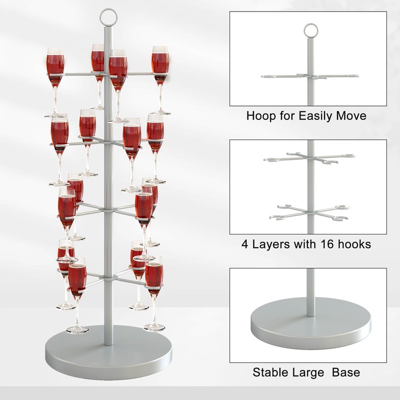 - Silver Cocktail Tree:This cocktail tree stand is made of high good metal,nice sliver polished,not easily scratch or rust,stable round base,4 tier with 16 hooks,a ring hole on the top for moving easily,really a necessary for party