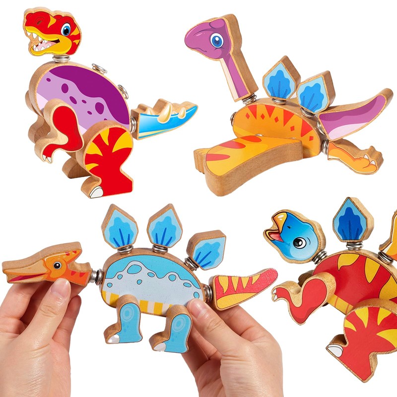 - Interactive Play & Learning: This set of wooden dinosaurs building blocks is designed to engage children in interactive play while enhancing their cognitive skills. The 4 different dinosaurs can be assembled and disassembled using snap buttons, fostering creativity and problem-solving abilities. What's even more exciting is that all arms, legs, and heads can be fitted onto different bodies to create imaginative dinosaur combinations.