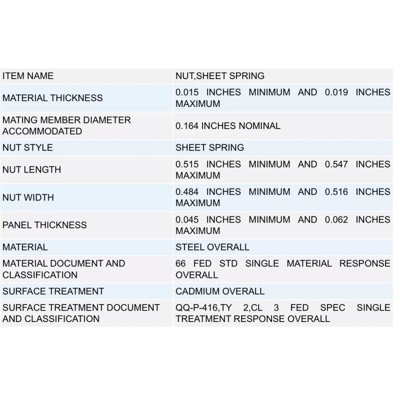 15R205 up for sale is a new set of 10 military grade sheet metal spring clip retainer nuts, NSN 5310009176365  military standard MS90724-29 see public specs below these fit very thin metal from zero up to around 1/16 thick , the outer dimensions are 1/2 x 1/2 x 0.154 total height , the hole for the screw is 0.132 small size the screw od would be around 0.197 OD , new parts from our warehouse ,