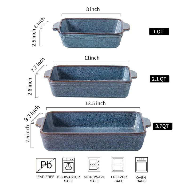 - Multiple Uses in Life: HVH's 9x13 casserole dish set includes 3 baking pans with different sizes: 13.5"L x 9.3"W x 2.8"H (3.7 qt) and 11"L x 7.7"W x 2.6"H (2.1 qt) and 8"L x 6"W x 2.5"H (1 qt) , very suitable for preparing and serving various dishes, including casseroles, lasagna, pasta, chicken, beef, vegetables, baking, storage and more. It is suitable for baking, storage and many more daily use that will meet your different needs.