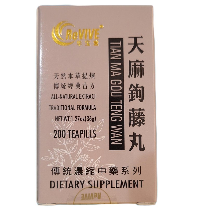 Tian Ma Gou Teng Yin Wan has been used historically to relax the Liver, ground excess Yang to stop Wind, and nourishes Yin to clear away Heat. A calmative often used for patterns that include dizziness, tremors, restlessness, tension, cramping, muscle spasm, etc. and for maintaining general balance in the nervous system. Contains: Tian Ma, Gou Teng, Shi Jue Ming, Zhi Zi, Huang Qin, Chuan Niu Xi, Du Zhong, Yi Mu Cao, Sang Ji Sheng, Ye Jiao Teng, Fu Ling. 200 teapills per bottle. NOTE: This statement has not been evaluated by the Food and Drug Administration. This product is not intended to diagnose, treat, cure, or prevent any disease.
