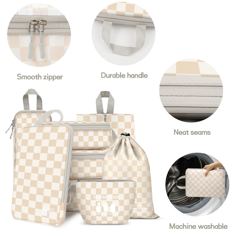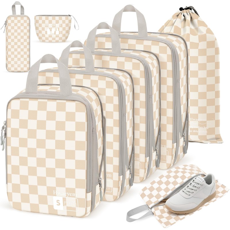HWAEYEM 8 Set Compression Packing Cubes Travel, Lightweight Durable Packing Cubes Compression, Accessories Bags Packing Cubes for Travel Luggage Organizer (Khaki Checkered)