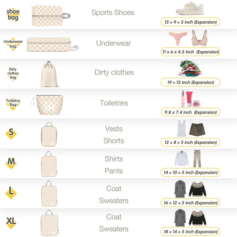 - WHAT’S IN BOX--Our packing compression cubes for travel 8 Set including 1 extra-large compression packing cube, 1 large compression packing cube, 1 medium compression packing cube, 1 small compression packing cube, 1 shoe bag, 1 underwear bag, 1 toiletry bag, 1 dirty clothes bag