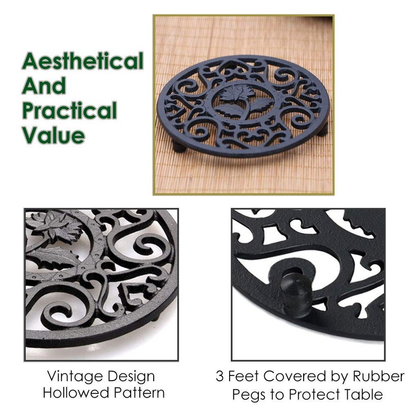 - 【CAST IRON TRIVET IDEAL FOR】Black iron mat of practical and aesthetic value, will add charm to your kitchen and dinner table while protecting your furniture and counters from heat. A great addition to your home décor and Wow yours guests. Ideal gift for wedding, home moving, Birthday, Parties, Christmas, etc.