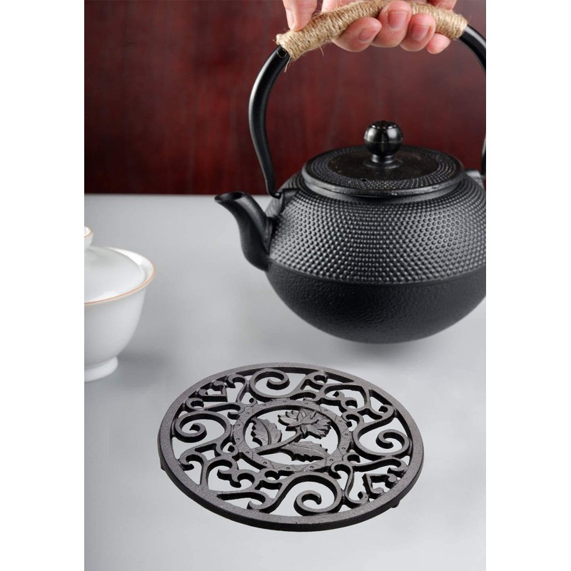 - 【CLASSIC FLORAL DESIGN】Classic matte black finish, floral hollow-curved design of vintage style. Special coating covering the trivet, gives the item vintage or rusted look, while protecting the item from rust and wear. Feet covered by quality and solid rubber pegs, to protect your table from heat, watermark and scratches. Indispensable Accessory of our Japanese Tetsubin cast iron teapot for a beautiful collection.