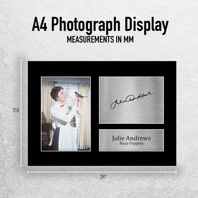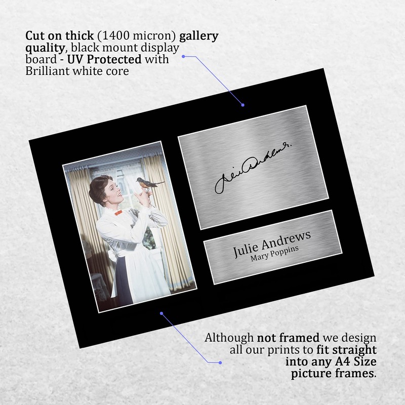 Professionally made in our studio, this A4 (297x210mm) unframed Julie Andrews display makes for an ideal gift idea. This laser printed quality photograph is mounted in a precision cut three windowed acid-free matt black display board. To the left of the display there is the main image. To the right of the display there are two metallic effect plaque areas for printed copies of the name and autograph signature. These mounts also come with a ridgid backing board making them very sturdy and can be displayed or hung as they are. If you wish to frame them they will fit in any A4 Frame. Alternatively we offer a framed version too. Lightweight, but of the highest quality, these make the ideal Christmas/Birthday gift for fans of all ages, and best of all, they definitely won't break the bank!
