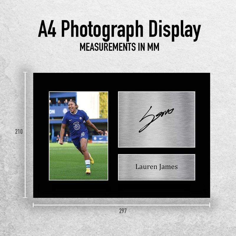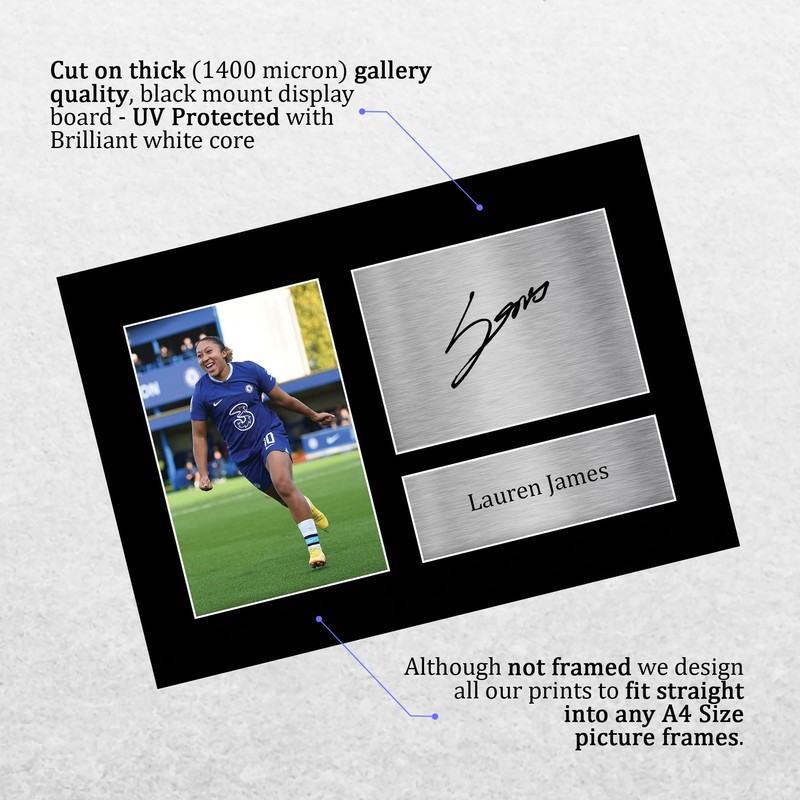 Professionally made in our studio, this A4 (297x210mm) unframed Lauren James display makes for an ideal gift idea. This laser printed quality photograph is mounted in a precision cut three windowed acid-free matt black display board. To the left of the display there is the main image. To the right of the display there are two metallic effect plaque areas for printed copies of the name and autograph signature. These mounts also come with a ridgid backing board making them very sturdy and can be displayed or hung as they are. If you wish to frame them they will fit in any A4 Frame. Alternatively we offer a framed version too. Lightweight, but of the highest quality, these make the ideal Christmas/Birthday gift for fans of all ages, and best of all, they definitely won't break the bank!