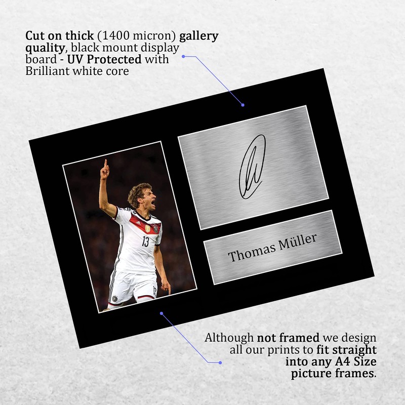 Professionally made in our studio, this A4 (297x210mm) unframed Thomas Muller Germany display comes with a high-quality picture alongside printed copies of their famous autograph signature. Mounted in a matt black using an acid-free display board, it’s perfectly finished with an autographed name in a silver, mock printed plaque.Lightweight, but of the highest quality, these make the ideal Christmas/Birthday gift for fans of all ages, and best of all, it definitely won't break the bank!