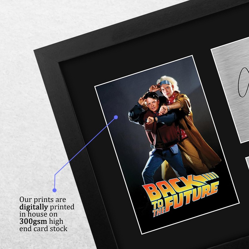 Professionally made in our studio, this US Letter Size (8.5x11 Inch) framed Doc Brown & Marty McFly Back to the Future display makes for an ideal gift idea. This laser printed quality photograph is mounted in a precision cut three windowed acid-free matt black display board. To the left of the display there is the main image. To the right of the display there are two metallic effect plaque areas for printed copies of the name and autograph signature. This print comes framed in a sleek black polycarbonate frame that compliments the matt mount display. Lightweight, but of the highest quality, these make the ideal Christmas/Birthday gift for fans of all ages, and best of all, they definitely won't break the bank!