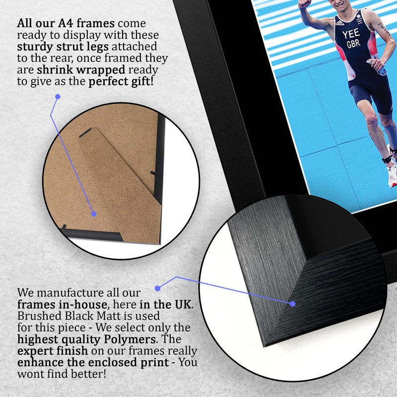 Professionally made in our studio, this A4 (330x245mm) framed Alex Yee Great Britain Olympics display makes for an ideal gift idea. This laser printed quality photograph is mounted in a precision cut three windowed acid-free matt black display board. To the left of the display there is the main image. To the right of the display there are two metallic effect plaque areas for printed copies of the name and autograph signature. This display comes ready framed in a sleek black polycarbonate frame that compliments the matt mount display and a clear perspex front to keep it dust free and clean. Lightweight, but of the highest quality, these make the ideal Christmas/Birthday gift for fans of all ages, and best of all, it definitely won't break the bank!