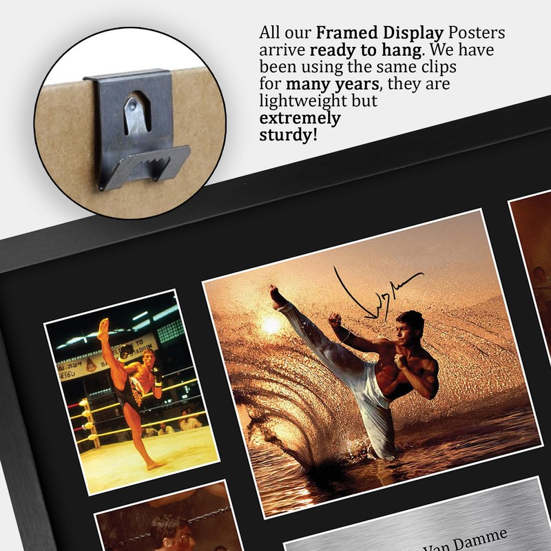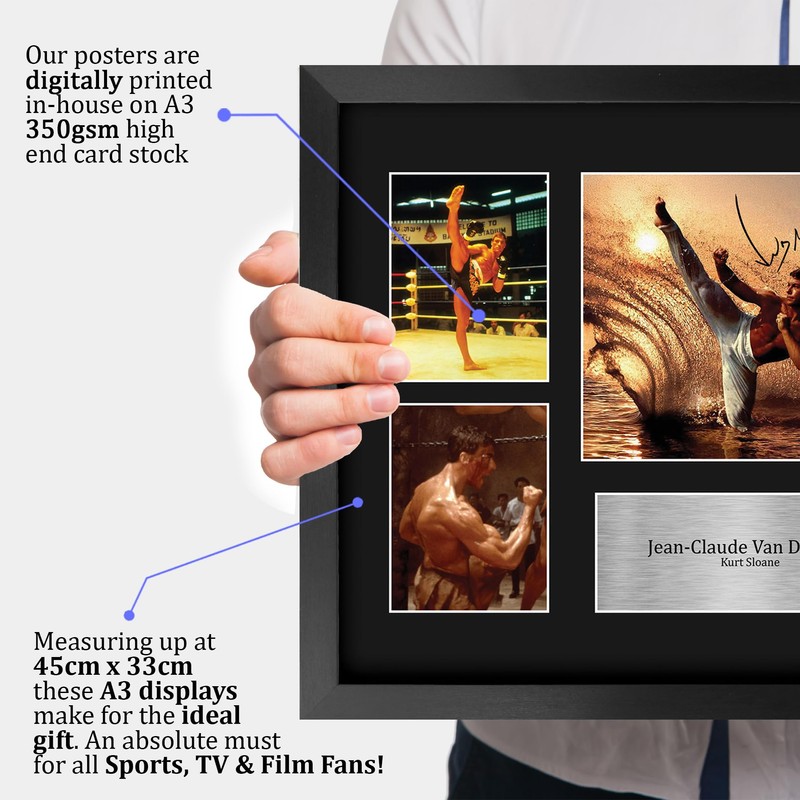 Professionally made in our studio, this A3 (330x445mm) framed Jean-Claude Van Damme display makes for an ideal gift idea. This laser printed quality photograph is mounted in a precision cut six windowed acid-free matt black display board. To the left and right of the display there are four classic images. To the centre of the display a main focal image taking pride of place with printed signature overlay. Below this is a metallic effect plaque area with the name and career information. This item comes framed in a sleek black polycarbonate frame that compliments the matt mount display and a clear perspex front to keep it dust free and clean. Lightweight, but of the highest quality, these make the ideal Christmas/Birthday gift for fans of all ages, and best of all, it definitely won't break the bank!