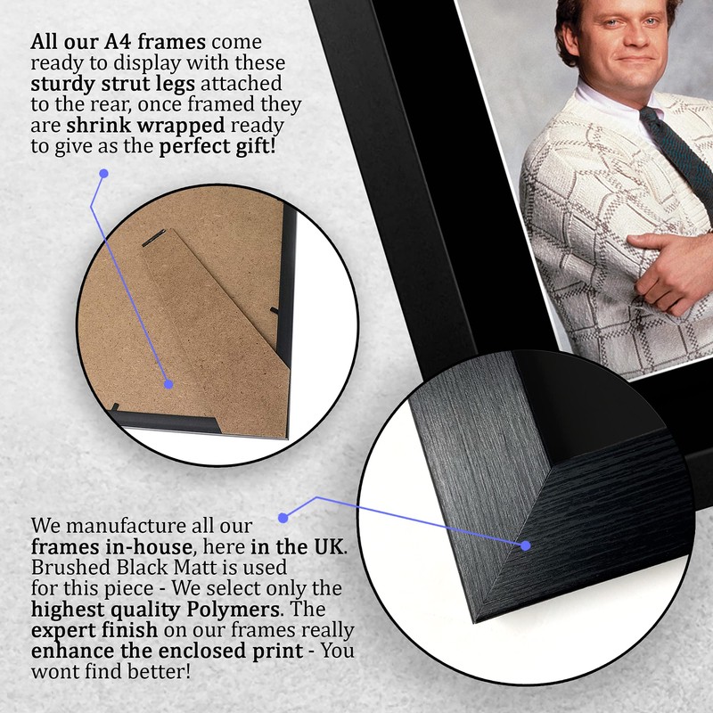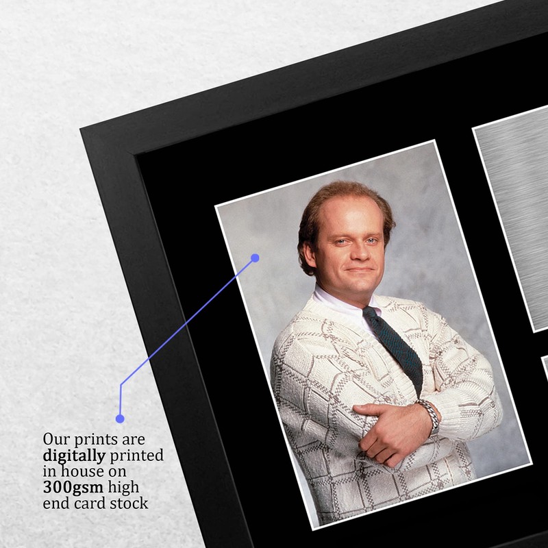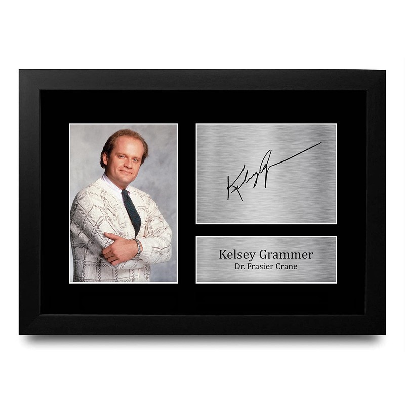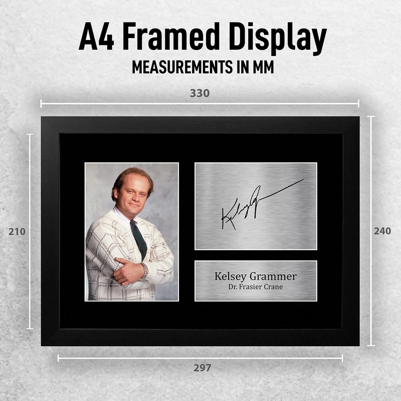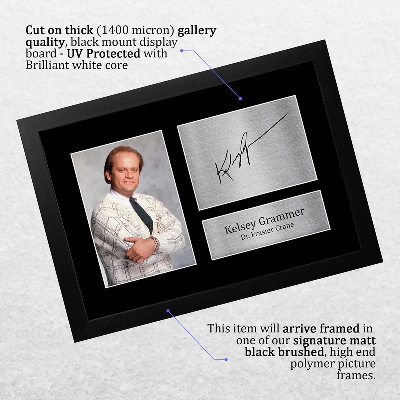Professionally made in our studio, this A4 (297x210mm) Kelsey Grammer display comes with a high-quality picture of Kelsey alongside a printed copy of his autograph signature. Mounted in a matt black using an acid-free display board, it’s perfectly finished with Grammer’s name in a silver, mock printed plaque. This Print comes Framed in a sleek A4 Black Polycarbonate frame that compliments the matt mount display. Lightweight, but of the highest quality, these make the ideal Christmas/Birthday gift for fans of all ages, and best of all, it definitely won't break the bank!